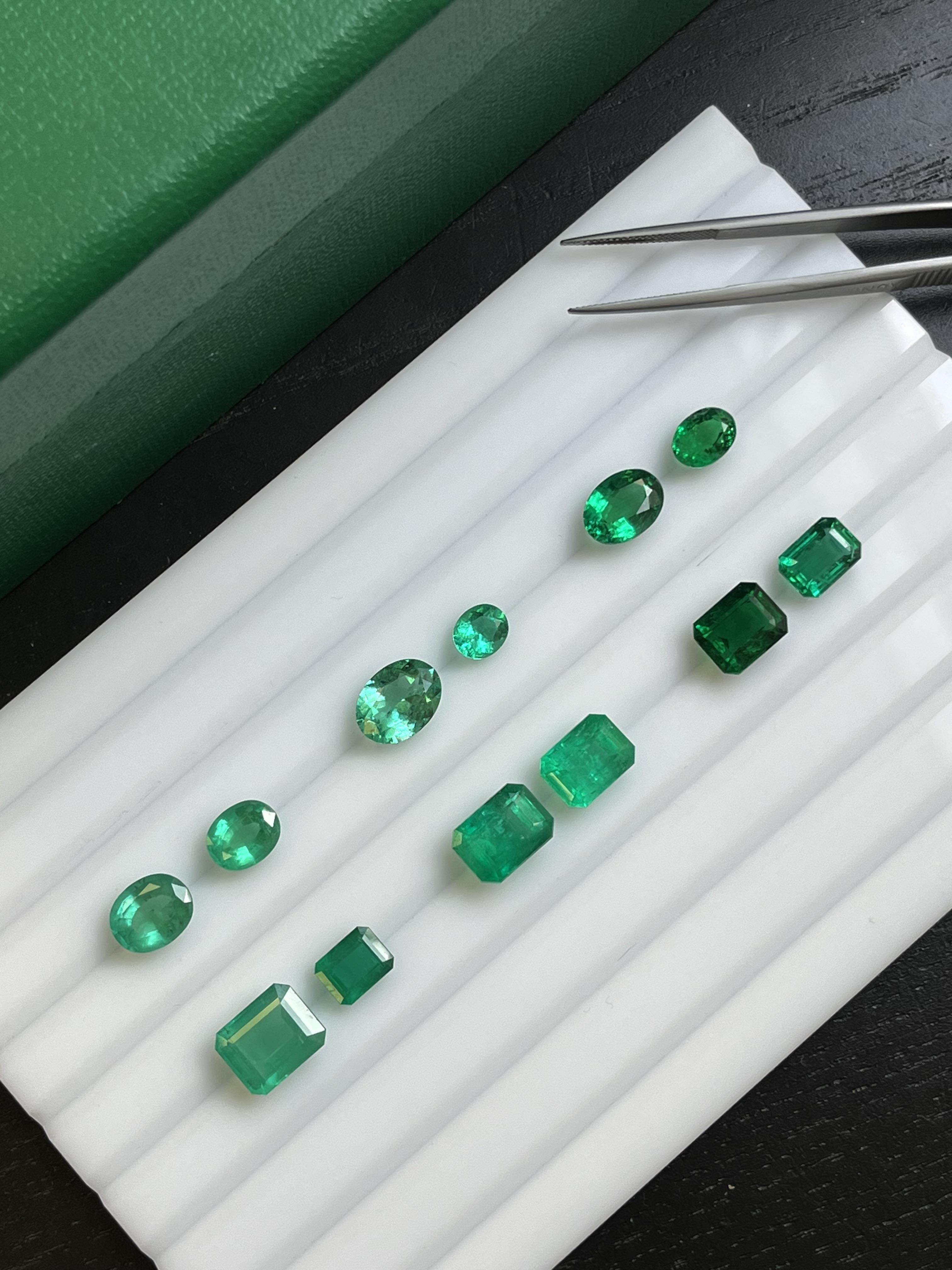 A refined selection of vivid emeralds by CR Gems — precision-cut stones showcasing depth of colour, clarity and versatility for design