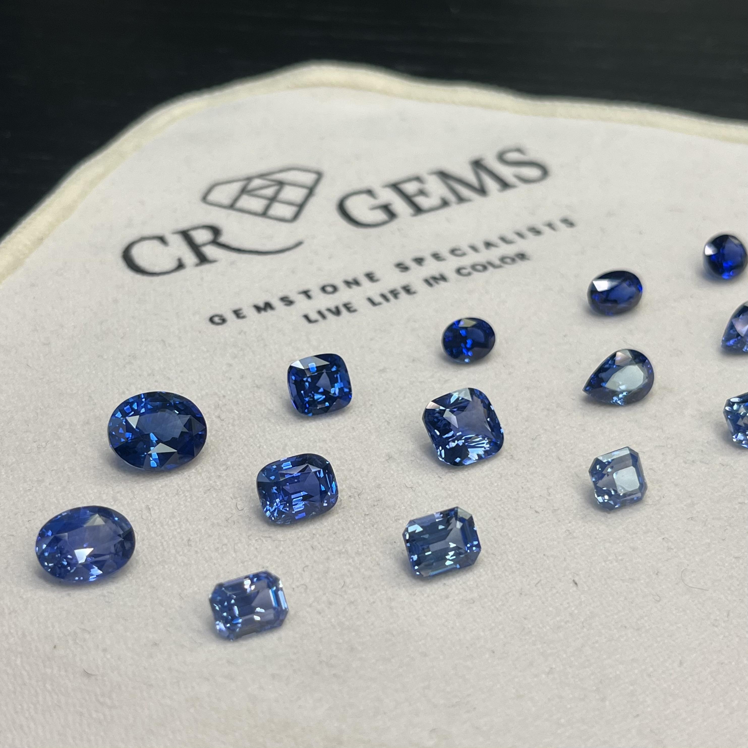 A curated selection of vivid blue sapphires by CR Gems — precision-cut stones ready for modern jewellery design