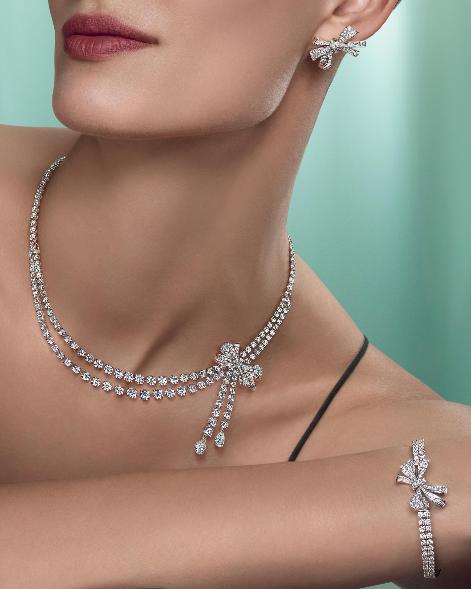 Elsewhere in the collection, the bow takes on a more sculptural presence. One necklace and earring suite is formed into a bold, intricate knot with curved, cascading ends, set with pear-shape diamonds and paired with a 10-carat pear-shape solitaire ring. Another interpretation softens the silhouette, with delicate white gold strands forming double-looped bows accented with baguette-cut and round diamonds.