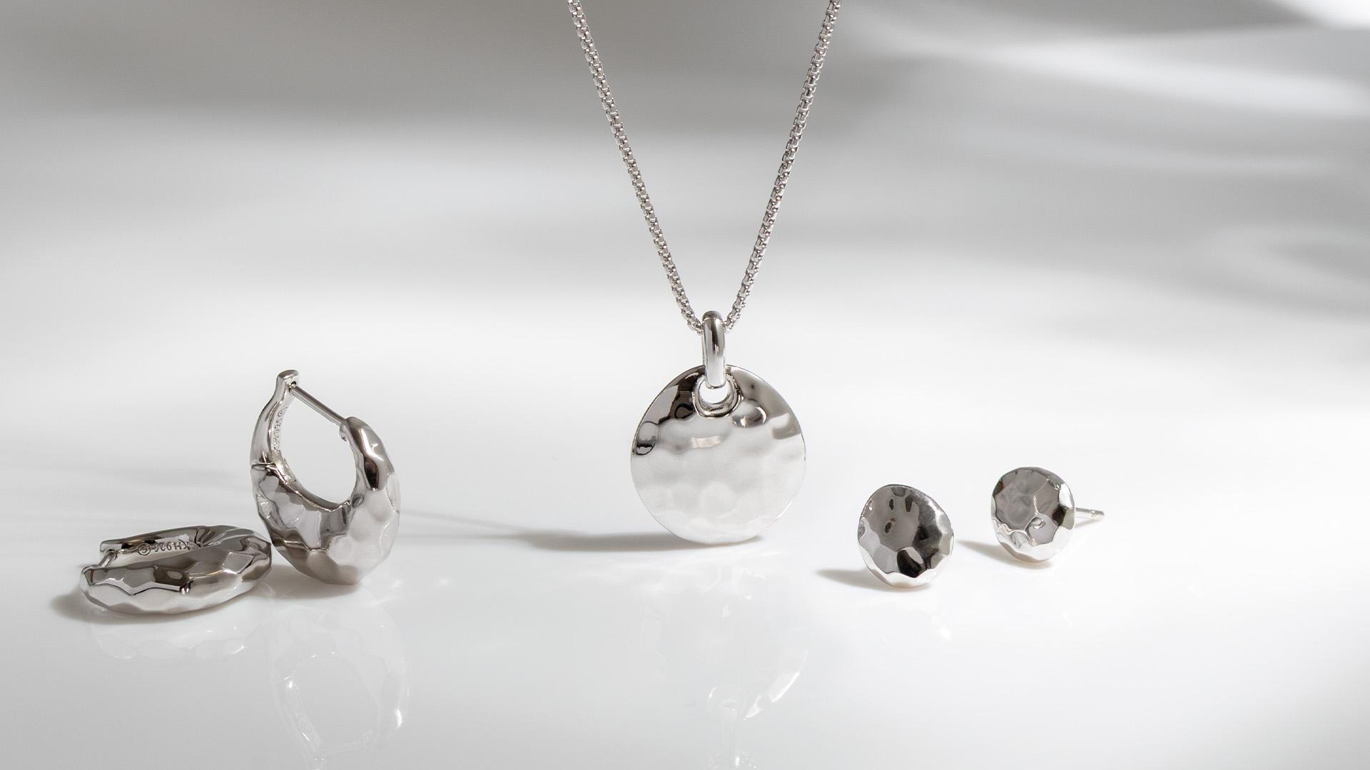 Across the collection, sterling silver pieces are finished with a softly dappled, mirrored texture, designed to catch and diffuse light across curved surfaces. Rings, bangles, necklaces and earrings are all shaped with rounded edges and fluid silhouettes, creating jewellery that feels both sculptural and wearable.