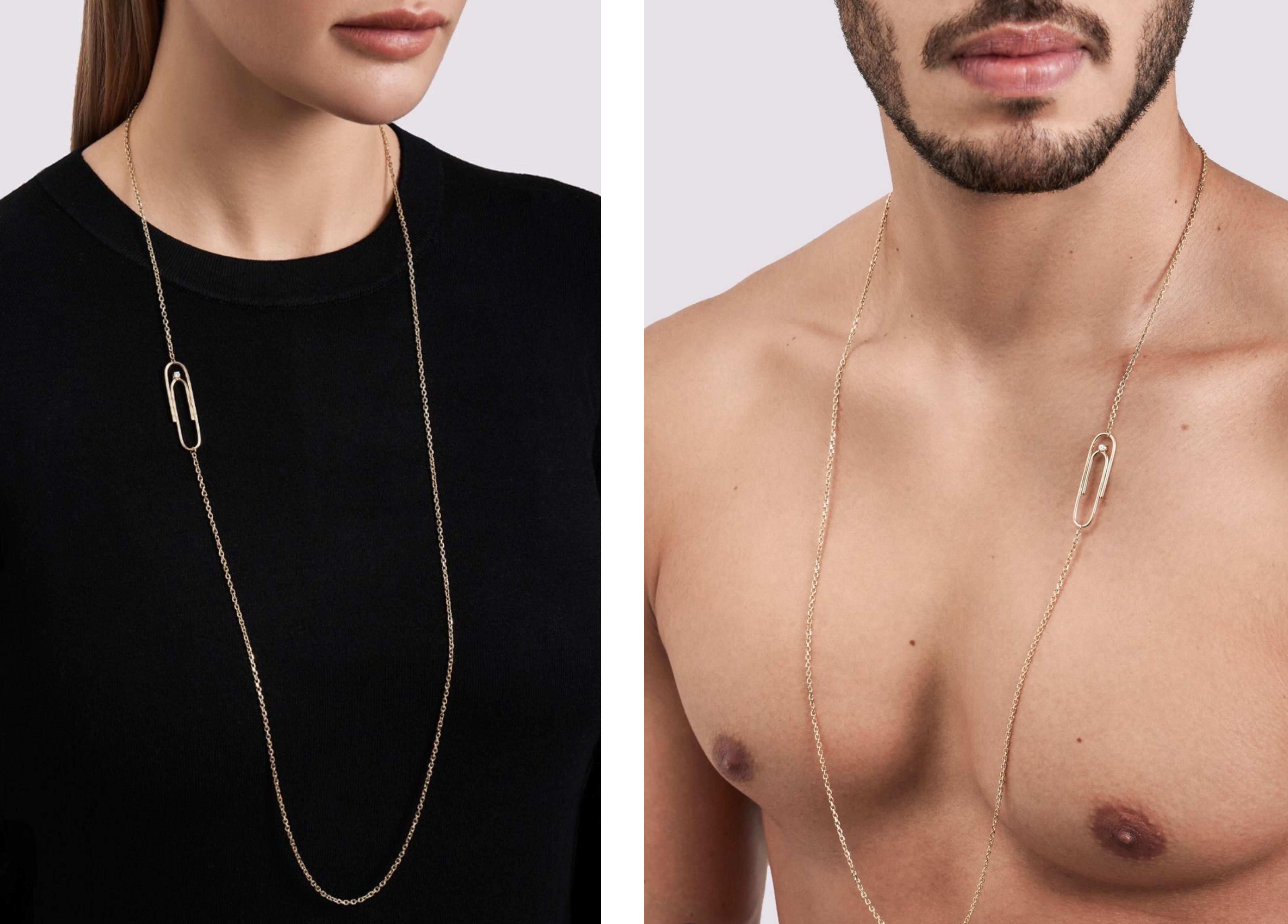 Another playful concept appears in the Clip collection, where the familiar shape of a paper clip becomes the starting point for jewellery design. Reinterpreted in gold and diamonds, the everyday object is elevated into necklaces and earrings that combine wit with elegance.