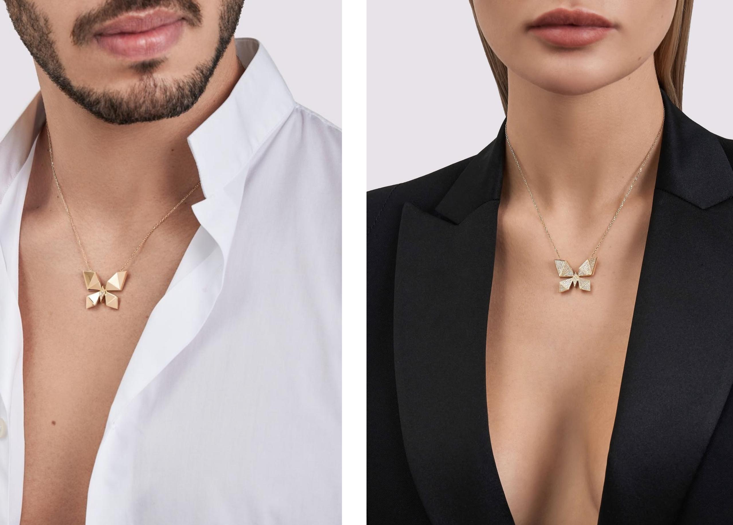 One of the brand’s most distinctive collections is Vol O Vent, inspired by the lightness and movement of a butterfly. Rather than literal representation, the motif is translated into angular, geometric forms that resemble folded origami structures.