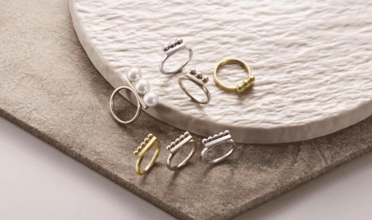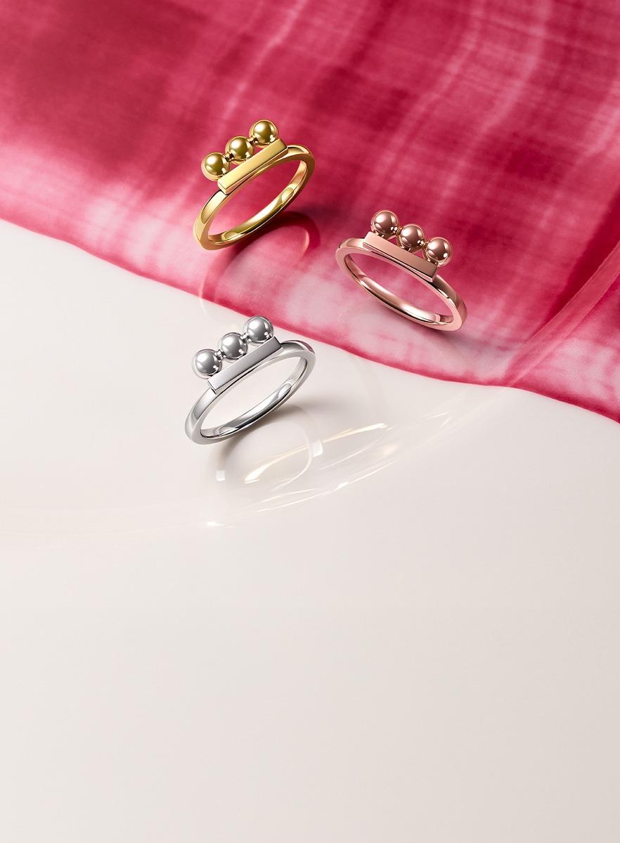 At the core of the collection is a metal reinterpretation of the house’s recognisable Balance motif. Traditionally expressed through pearls aligned in measured rhythm, the concept is now realised through polished gold spheres arranged horizontally across the finger.
